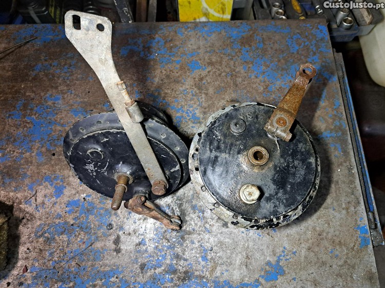 O cubo da frente está completo com veio, guarda pó, tirante de suporte, prato de travão e patilha. Está calcionado e o prato de travão está preso ao cubo