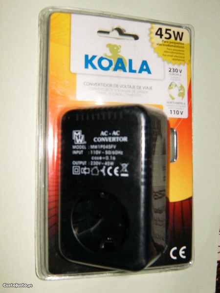 Transformador de corrente alterna novo em blister com ficha de entrada a 110V e tomada de saída a 220V de 45 Watts. Formas de pagamento! Numerário MB WAY Transferência bancária
