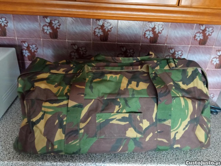 Saco de transporte do Exército Holandês (Koninklijke Landmacht, KL) padrão de camuflagem DPM Woodland, usados em bom estado geral: não têm cortes, nem buracos, mantêm toda a sua integridade e utilidade, simplesmente não têm as cores tão vivas como quando eram novos.