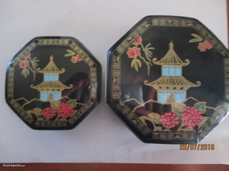 2 caixas de lata antigas pretas com motivos orientais que se encaixam uma na outra.