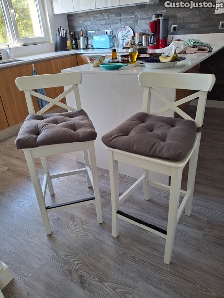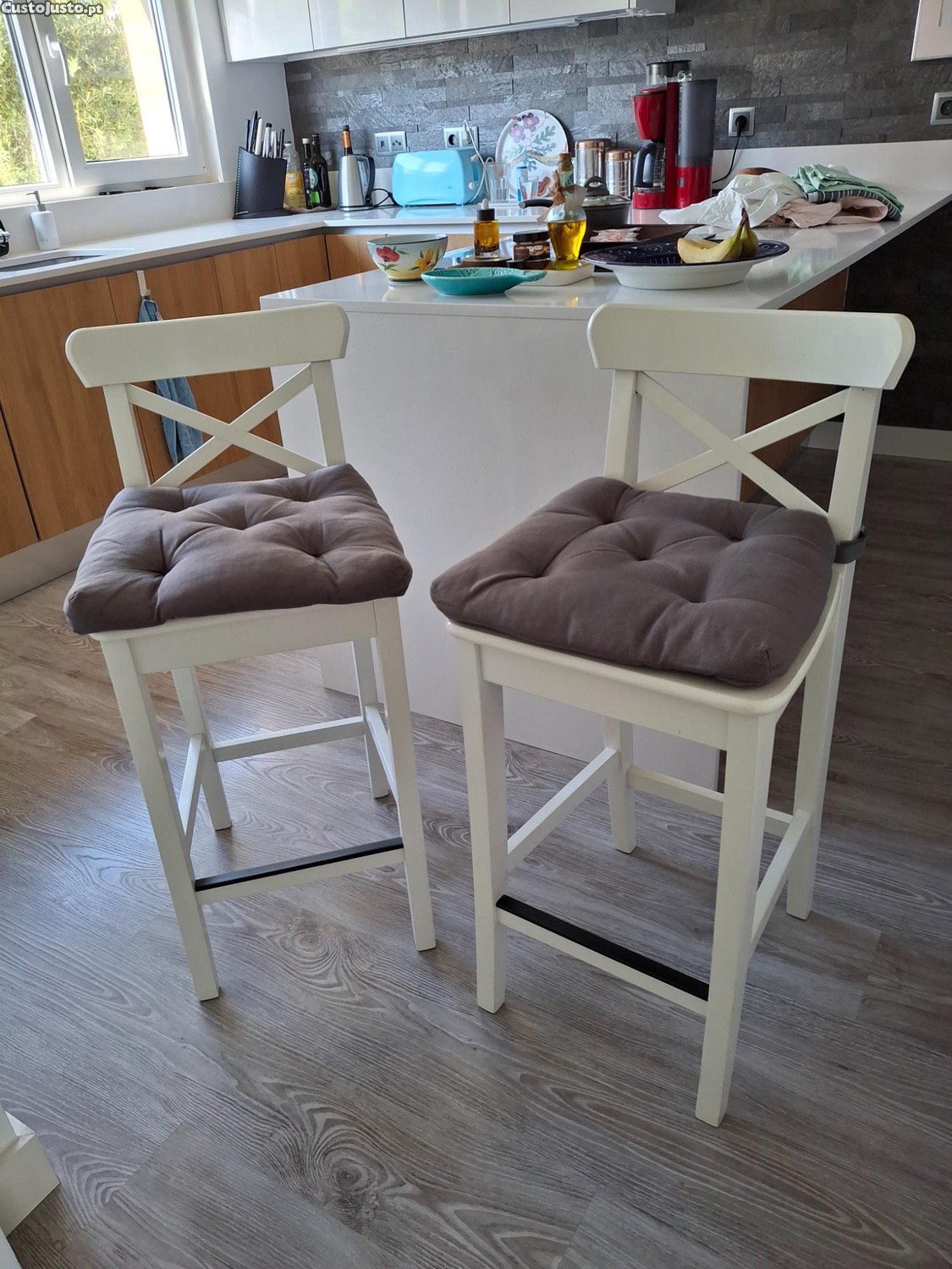 Bancos (2) alta (IKEA Ingolf) de madeira solida com almofadas, tudo como novos. Alt (assento): 62, Larg: 40, Prof: 40.