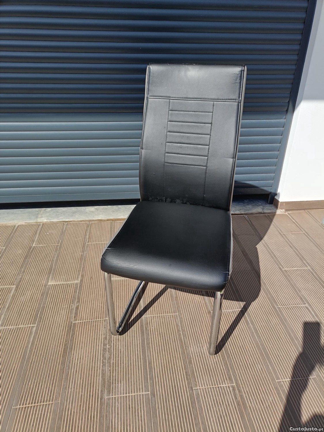Cadeira usada de cor preta, com pé formato U em aço cromado. Está em bom estado, apenas com pequeno desgaste numa parte lateral do assento.