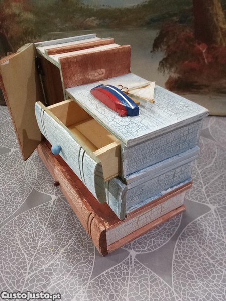 Caixa em madeira 4 gavetas. Caixas a imitar livros para arrumação de joias ou pequenas peças. Estilo náutico, na parte de cima foi aplicado um pequeno veleiro.15X19X10 Cm. Preço 15 euros