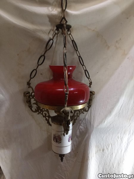 Candeeiro teto 3 hastes em bronze tubo de porcelana abajur redondo vidro vermelho com chaminé interior. Peça lindíssima. Preço 75 Euros