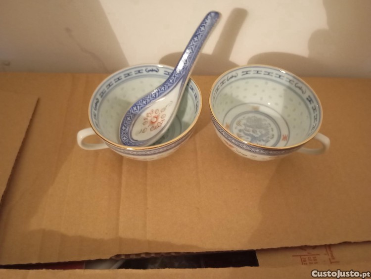 Preço: 3 €Conjunto de loiça antiga brancos e azuis 2 chávenas 1 colher