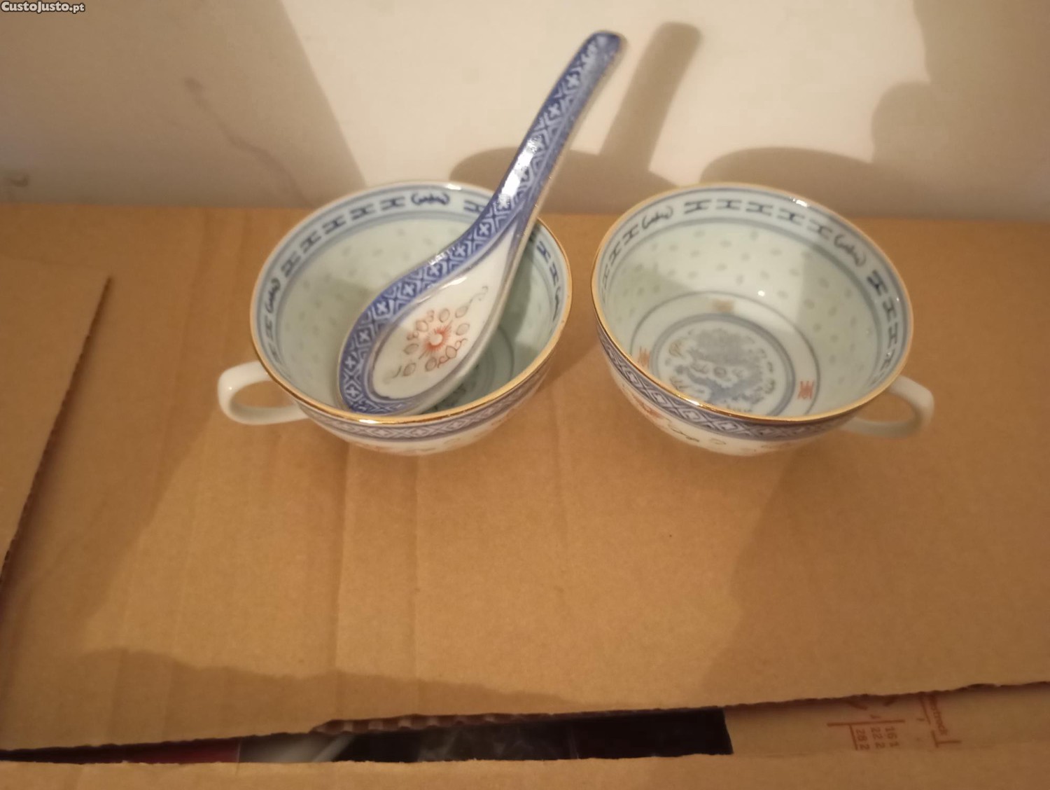 Conjunto de loiça antiga brancos e azuis 2 chávenas 1 colher