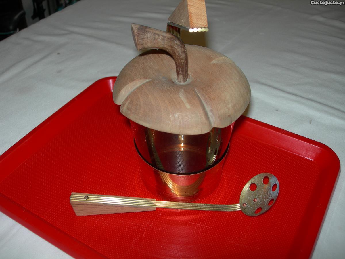Copo de vidro com pega tampa e colher. Possivelmente para levar á mesa com azeitonas ou outro tipo de coisas desse gênero. Componentes: vidro, alumínio e madeira. Altura 20 cm.