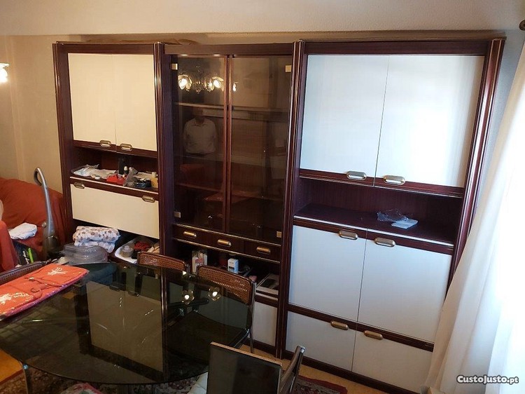 Móvel de sala composto por 3 módulos. Com portas em vidro no módulo do meio. Transporte a cargo do comprador.