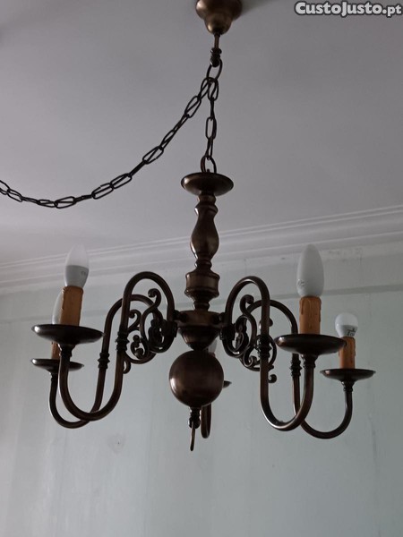 Lustre de sala recente, estilo holandês, 5 lâmpadas, máximo por lâmpada, 60 watts. Económico, com as medidas de 1,20 de altura por 70 de largura. Em novo, o custo foi de 700 euros, em bronze, muito simples e elegante.