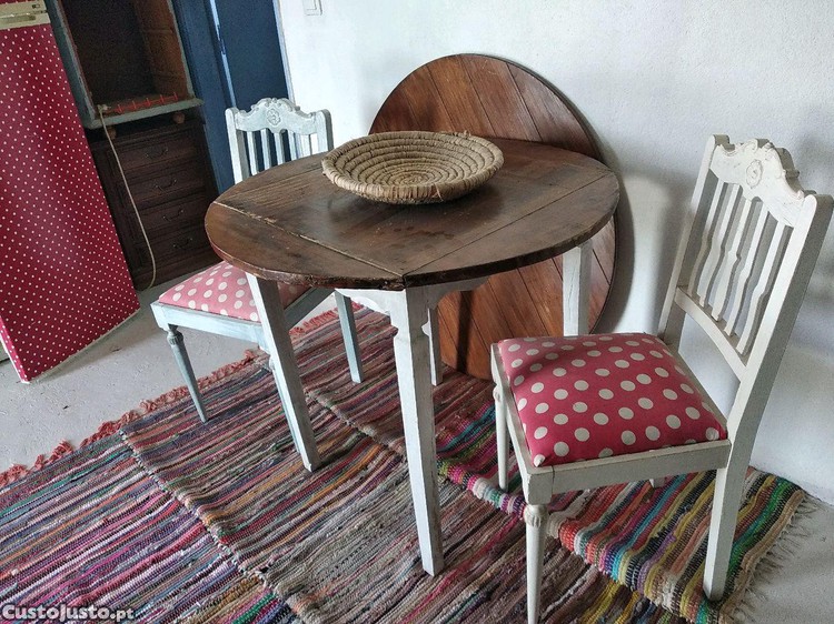 Antiga mesa de restaurante da Baixa de Lisboa e duas cadeiras portuguesas dos anos 70... peças com história. Precisam de alguma atenção mas ficam muito bem assim mesmo com o desgaste que apresentam, numa casa de praia ou de campo. Reciclar móveis de madeira, salva árvores que já são tão poucas e preserva a história. Poupa o ambiente os recursos e a economia portuguesa.
