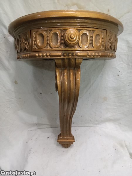 Mísula em madeira trabalhada em altos e baixos-relevos com gaveta A base tem de largura 35 Cm. de fundo 23 Cm. Altura total 45 Cm. Toda a mísula está pintada na cor ouro Preço 40 Euros