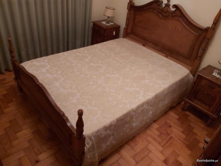 Mobilia de quarto dos anos 50 em bom estado - Inclui cama (colchão e estrado), cómoda e espelho, guarda vestidos, duas mesas de cabeceira e duas cadeiras.