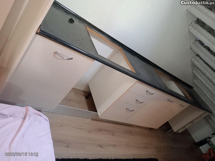 Móvel de cozinha em estado usado, apenas a parte inferior. Apresenta alguns sinais de uso, mas ainda em bom estado de conservação. Ideal para complementar o seu espaço de cozinha de forma prática e económica.