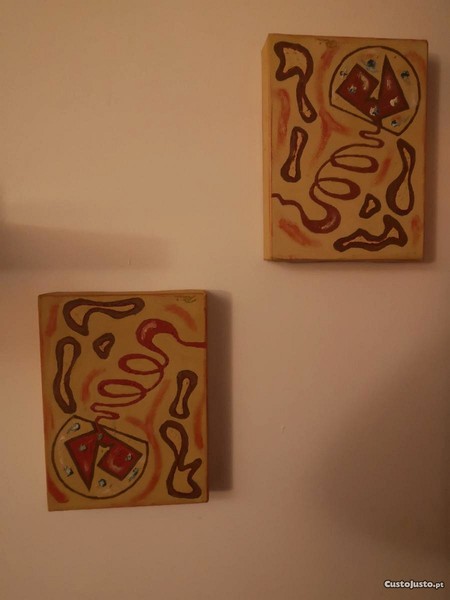 Vendo dois quadros pintados em que o tema são os Gémeos. São dois quadros de 0,28cm x 0,18cm com pintura em relevo. Podem ser moldurados ou ficarem como estão. O tema de Gémeos aparece nesta obra com o intuito de ligar os dois cordões umbilicais que aparecem na imagem de cada quadro e mante-los juntos. Garanto que são quadros únicos e que não existem cópias. O valor destas peças não incluem os portes de envio. Isso fica a cargo do comprador. Não envio a cobrança. Entrego em mãos na zona da Baixa da Banheira. Podem telefonar a partir das 19h30 até as 21h. Qualquer dúvida, não hesitem em perguntar. Não respondo a brincadeiras e a ofertas sem nexo.