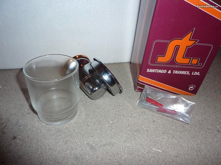 Suporte com copo para lavar dentes, cor cromado e dourado,estado novo e dentro da caixa.