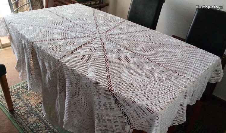 Toalha de mesa em crochet branco, feito à mão, em linha número 12 Âncora, algodão, tamanho 2 x 2 m, em muito bom estado.