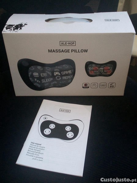 Almofada de massagens Ale-Hop. Tem cabeças rotativas, função de calor, é portátil e compacta, pode ser usado em casa, trabalho ou carro. Vem com adaptador de ligação à corrente, ligação ao isqueiro do carro, manual, na caixa. Muito pouco uso (usada 2 ou 3 vezes). Em excelente estado.