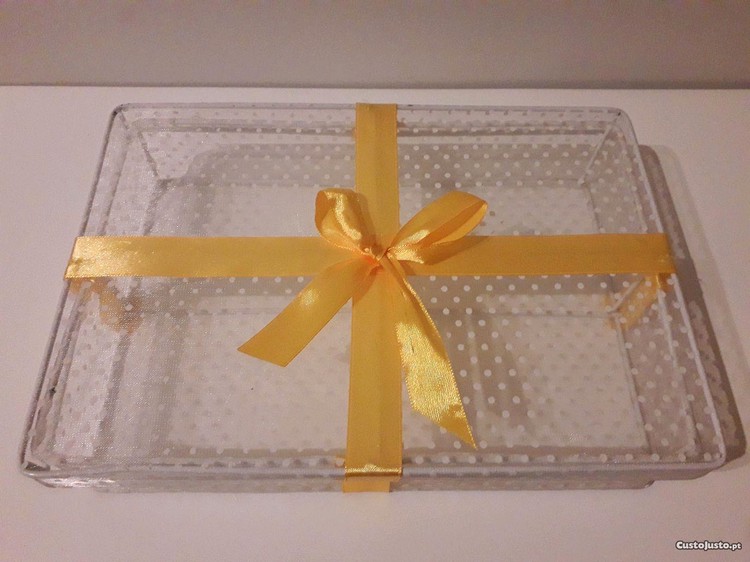Caixa de aros metálicos forrada a tecido transparente com bolinhas brancas e laço amarelo.
