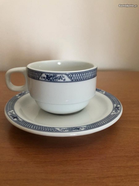 Conjunto de chávena n 2 (chá) e pires do fabricante Costa Verde. Loiça muito resistente, adequada para uso em hotelaria. Porcelana branca decorada com motivos azuis. Linha Vidago. Penso que esta linha já não está em produção. Tenho várias unidades, novas, a estrear. Desconto para quantidade.