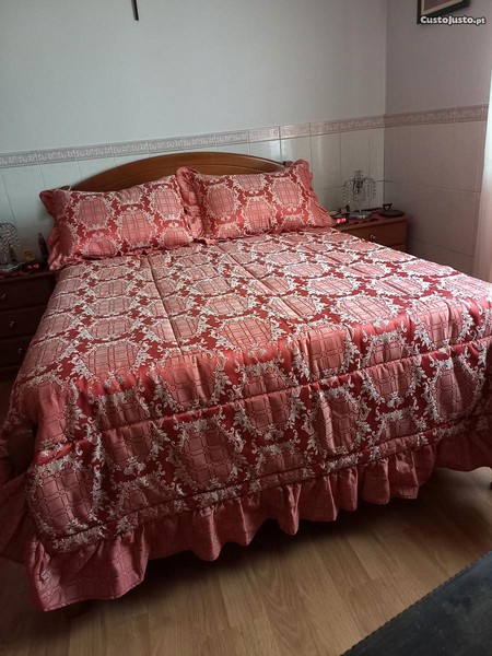 Colcha/Edredon de aquecimento em tecido estampado, com folho, mais 2 fronhas para almofada grande, também com folho.
