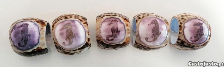 Vendo Conjunto de 5 porta-guardanapos esculpidos em búzio, e com motivos de cavalos-marinhos. São 5 porta-guardanapos impecáveis + 1 que apresenta algumas rachas. Nunca foram usados.