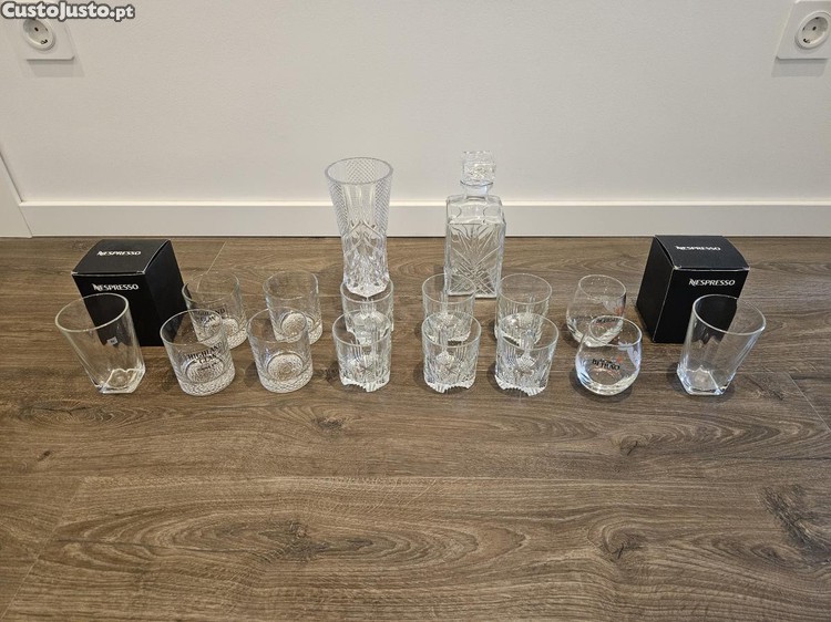 Conjunto com 16 unidades, composto por 10 copos para Whisky, 2 copos para Licor Beirão, 1 garrafa, 1 jarra e 2 copos para café da Nespresso. Entrego em mão no Barreiro.