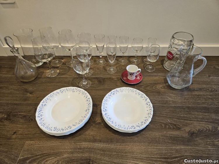 Conjunto de louça com 29 peças, composto por, 6 pratos rasos, 4 pratos fundos, 1 caneca para cerveja, 2 jarros, 1 garrafa, 13 copos de pé alto sortidos e 1 chávena para café. Em bom estado de conservação. Entrego em mão no Barreiro.