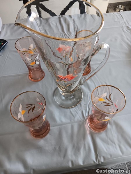 Preço: 25 €Conjunto para refresco de verão, em vidro soprado e pintado à mão, anos 60