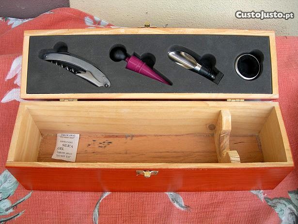 Vendo um estojo para garrafa com conjunto de bar, novo, composto por um estojo em madeira que inclui 4 peças para bar de alta qualidade.