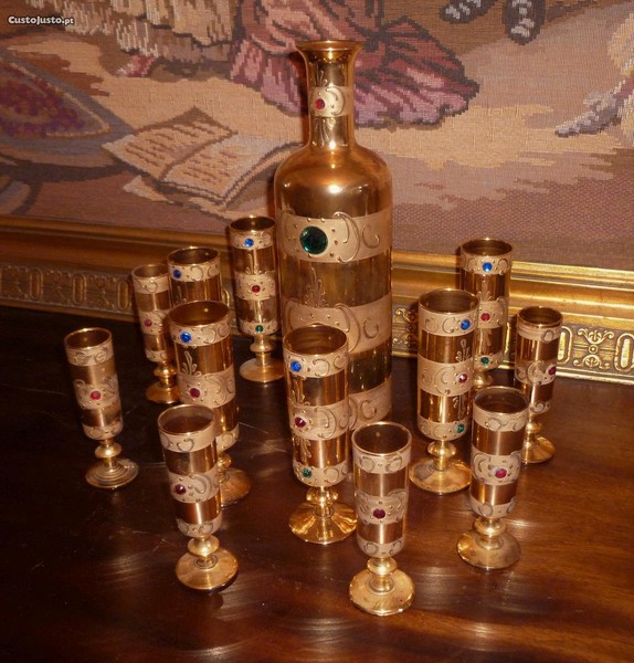 Preço: 250 €Garrafa e 12 copos em vidro Murano ouro