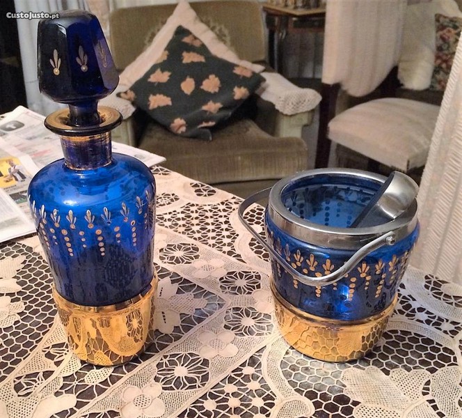Garrafa e balde gelo completo, em vidro Murano pintado á mão a ouro. Peças lindas em óptimo estado.