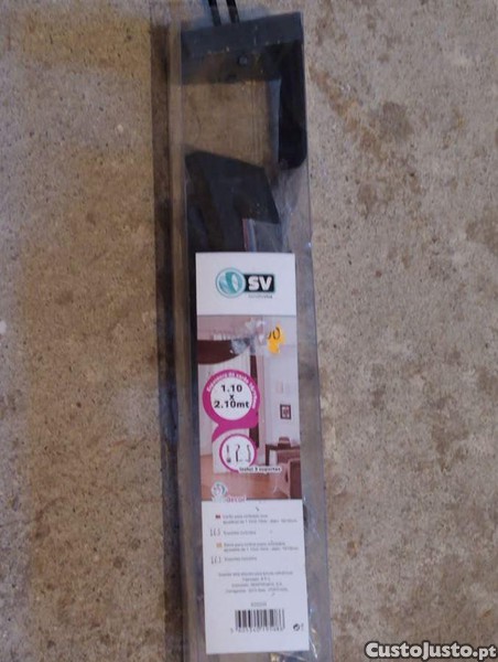 Kit varão metálico extensível preto e dourado da marca "SV" novo, ainda na caixa. Inclui 3 ganchos suporte e 2 terminais Dimensões: 110 cm a 210 cm de comprimento; 19 mm diâmetro.