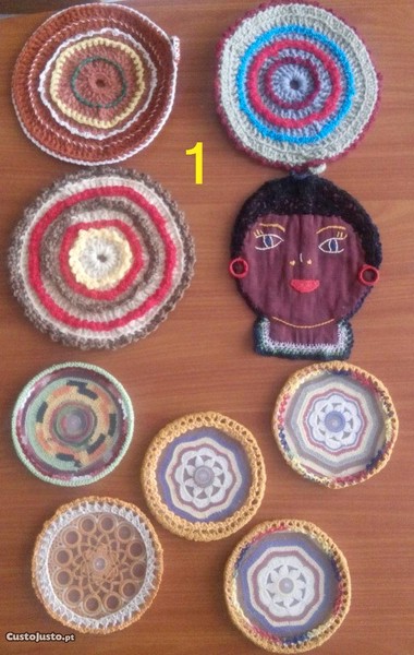 Pegas e bases de renda. Tudo bordado à mão em linha de crochet e em tecido. Alguns com enfeites extra. Tamanhos entre 15 a 20 cm de diâmetro.