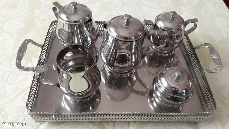 São 6 peças em inox: chaleira, cafeteira, leiteira, açucareiro e boleira, em bandeja com pés. Medidas: 33x42+5(asas). Sem uso, apenas serviu para decoração.