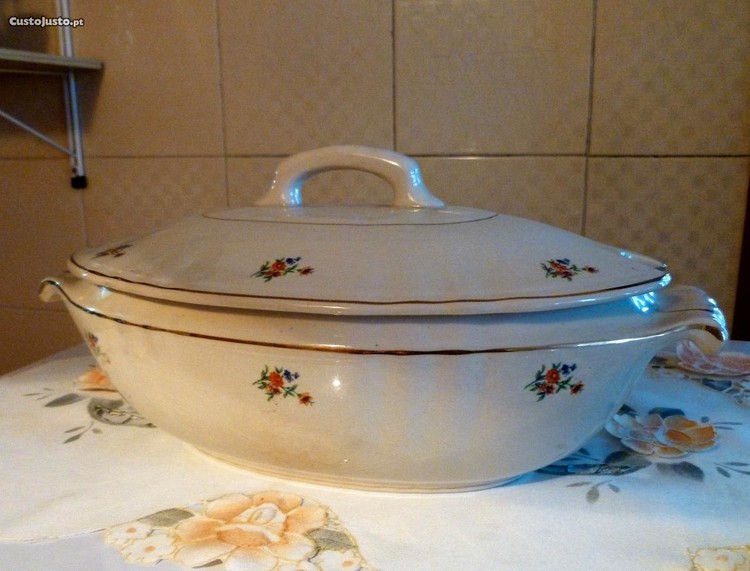 Terrina antiguidade em loiça de Sacavém, oval com 35 cm diâmetro maior. Em estado envelhecido, mas bom.
