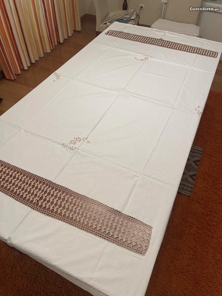Toalha de mesa quadrada com renda e bordada, à mão, completamente nova.