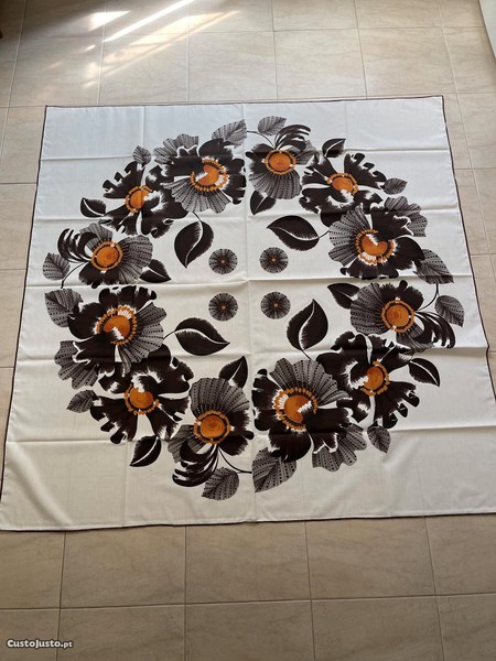 Toalha de mesa quadrada em branco, castanho e laranja, nunca usada.