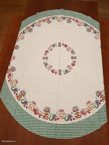 Toalha de mesa redonda creme e verde ao quadradinhos com motivos de cozinha, completamente nova.