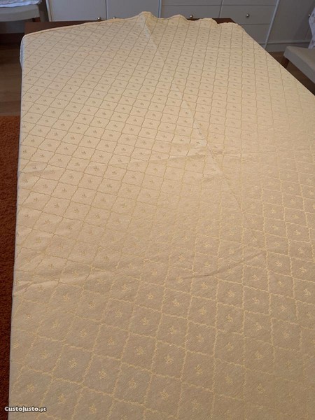 Preço: 25 €Toalha de mesa redonda em tom creme com detalhes dourados