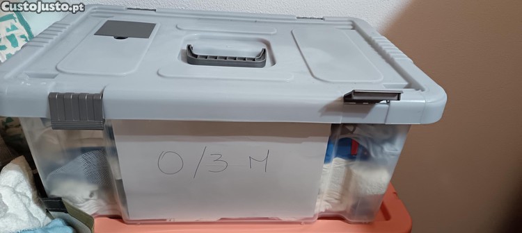 Caixa com várias peças de roupa para bebê dos 0 meses aos 3 meses.
