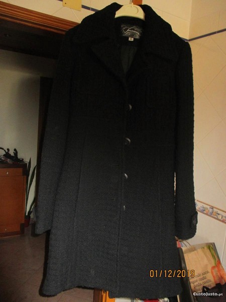 Casaco comprido preto, S : altura 90cms e por debaixo braços 41 cms.