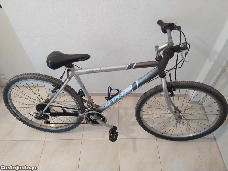 Bicicleta cinzenta da marca "Team" com roda 26", 18 velocidades e quadro em alumínio. Artigo com marcas de uso e a precisar de algumas afinações. Transporte a cargo do comprador.