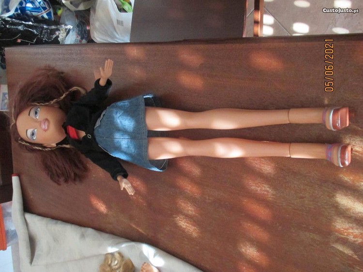 Boneca de plástico, bastante expressiva, comprida com cerca de 80 cms.