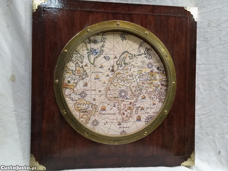 3 Olhos de Boi em bronze recuperados de antigo navio. Cada olho de boi está aparafusado em placa de madeira com 40 Cm. de lado na mesma foram aplicados 4 cantos em latão. Cada olho de boi comporta uma carta náutica antiga a demarcar as rotas dos navegadores portugueses. Preço dos 3 quadros 225 Euros