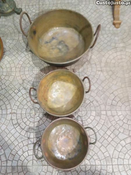 Preço: 85 €3 tachos em cobre com fundos remendados e rebitados à moda antiga