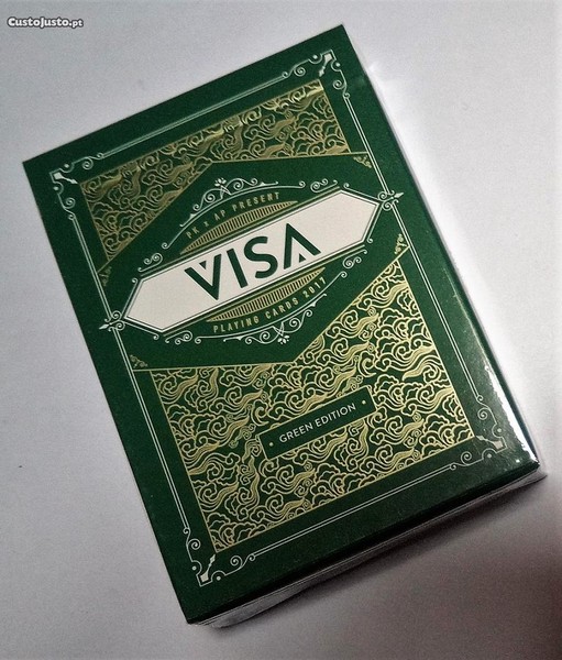 Agora disponível pela primeira vez - o longo antecipado Green Visa Deck! Este novo baralho de cartas vem em uma cor verde profunda com design acentuado em ouro metálico. Impresso nos EUA na United Stated Playing Card Company, o baralho verde foi impresso no THIN CRUSHED STOCK.