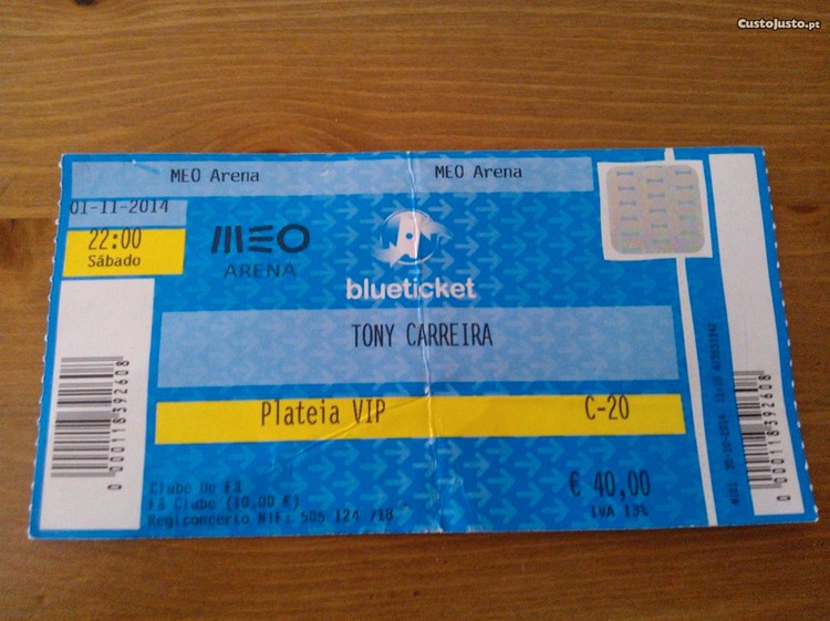 Preço: 4 €Bilhete Concerto Tony Carreira - Meo Arena