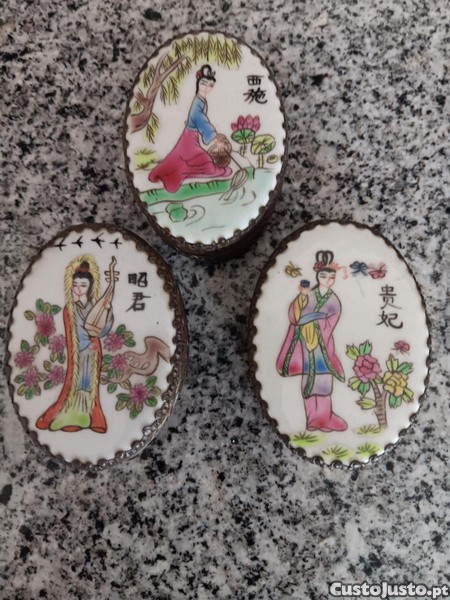 Caixas dos anos 80, todas feitas à mão em porcelana na tampa com espelho interior, uma em relevo muito bem feito, azul. Todas em latão chinês trabalhado. Pinturas igualmente manuais. Em óptimo estado. Posso também vender em separado em preço a acordar. A caixa em relevo é sempre de preço mais elevado pela qualidade.