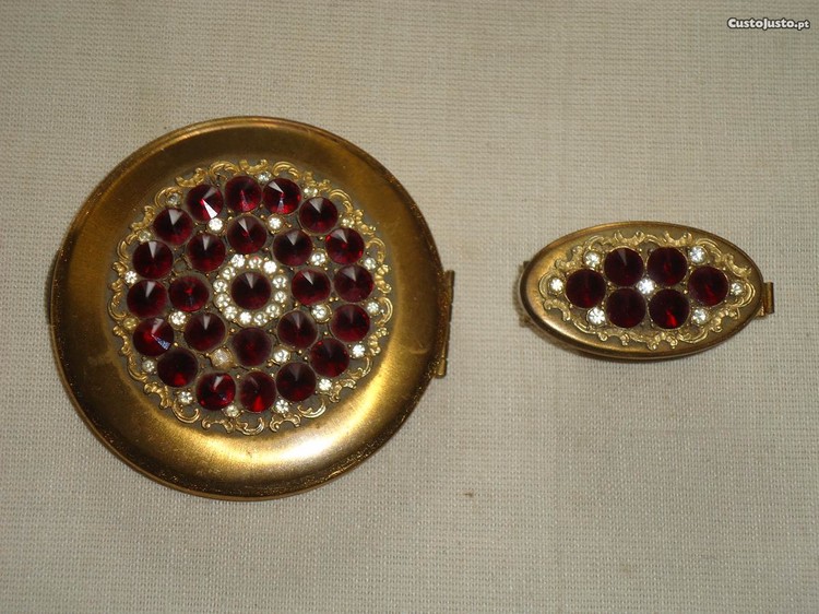 Conjunto antigo de caixa de pó de arroz e peça com espelho com suporte de baton