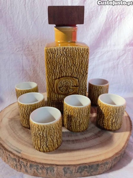 Lindo conjunto da Secla, garrafa e 6 copos, alusivos às grutas de Santo António. Cor Mel. Em muito bom estado.
